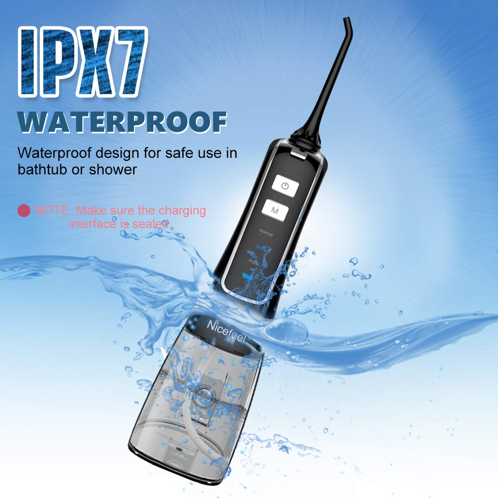 Thanks to IPX7 water-proof design, Nicefeel cordless oral irrigator will be able to withstand immersion in water which means it could be safely used in the shower. Water tank locks to handle tightly and completely prevents leakage. The handle covering anti-skip particles is better to hold when it gets wet. An high-grade double layer filtration net is at the nozzle of the filter inner cylinder making it easier to remove unwanted water impurities.