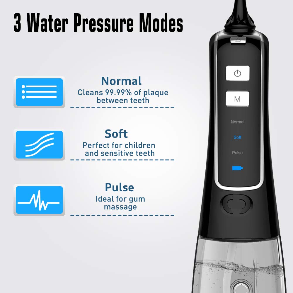 【3 FLOSSING MODE】Normal,soft and pulse mode is selectable for different oral care needs and people. Our cordless jet water flosser has memory function, you can set your favorite mode before power on. Two minutes auto-timer to avoid it still working after you finish cleaning.